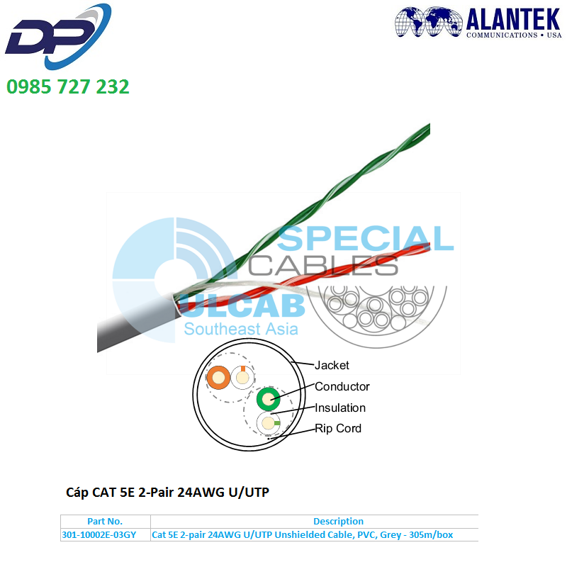 Cáp Thoại Alantek ( 301-10002E-03GY ) Cat 5E 2-pair 24AWG U/UTP Unshielded Cable, PVC, Grey – 305m/box | Chính Hãng – Giá Tốt Nhất