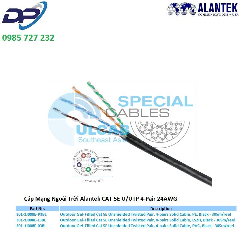 Cáp Mạng Ngoài Trời Alantek ( 301-1J008E-P3BL ) Outdoor Gel-Filled Cat 5E Unshielded Twisted Pair, 4-pairs Solid Cable, PE, Black – 305m/reel