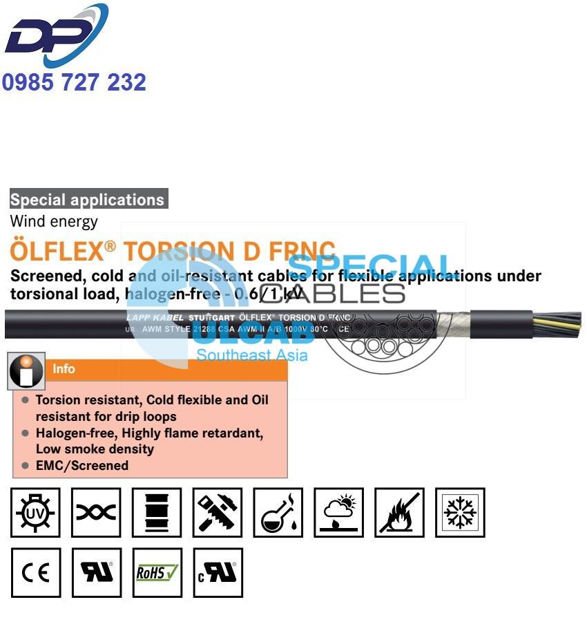 ÖLFLEX® TORSION D FRNC, cULus AWM (II A/B) OIL RES I+II, power and control cable 0.6/1 kV, drip loop/wind energy torsion -40°C/+90°C, HFFR/ LS0H, shielded