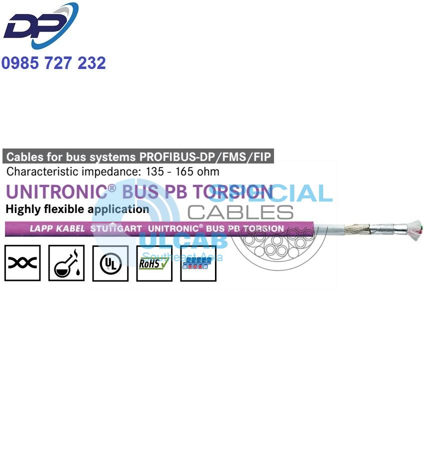 Bus cable for PROFIBUS-DP, -FMS and FIP. For torsional stress, e.g. robot: ± 180° per 1 m, halogen-free, flame-retardant. Temp. range from -25°C to 75°C