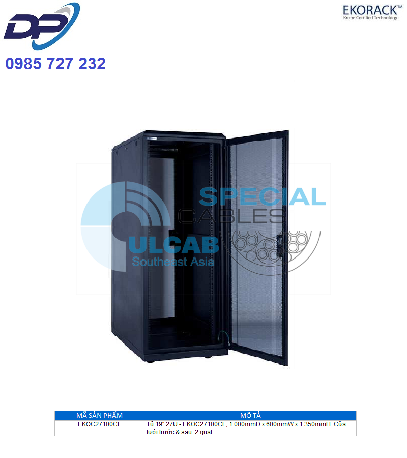 | EKOC27100CL | Tủ 19″ 27U – EKOC27100CL, 1.000mmD x 600mmW x 1.350mmH. Cửa lưới trước & sau. 2 quạt |