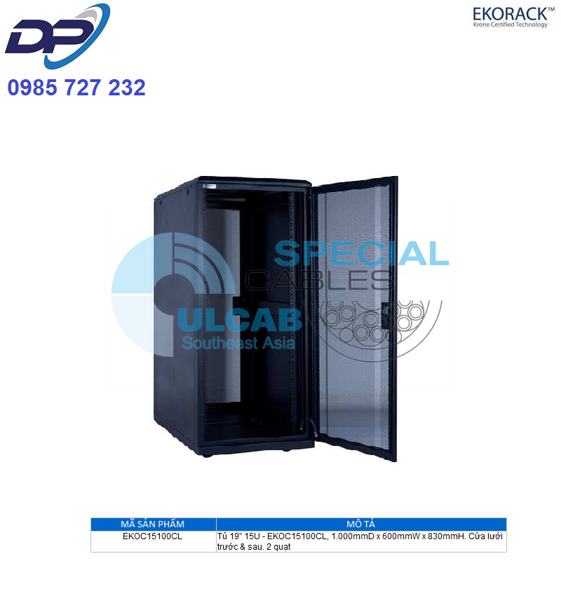 | EKOC15100CL | Tủ 19″ 15U – EKOC15100CL, 1.000mmD x 600mmW x 830mmH. Cửa lưới trước & sau. 2 quạt |