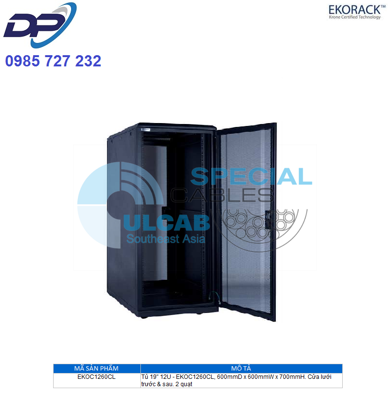 Cabinet EKORACK ( EKOC1260CL ) Tủ 19″ 12U – 600mmD x 600mmW x 700mmH. Cửa lưới trước & sau. 2 quạt