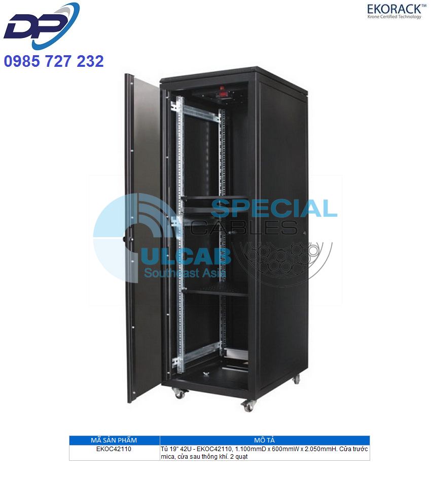 | EKOC42110 | Tủ 19″ 42U – EKOC42110, 1.100mmD x 600mmW x 2.050mmH. Cửa trước mica, cửa sau thông khí. 2 quạt |