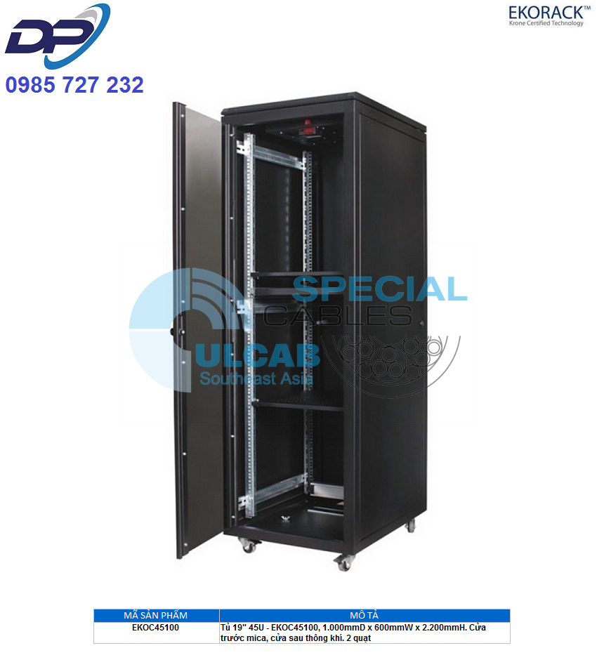 | EKOC45100 | Tủ 19″ 45U – EKOC45100, 1.000mmD x 600mmW x 2.200mmH. Cửa trước mica, cửa sau thông khí. 2 quạt |