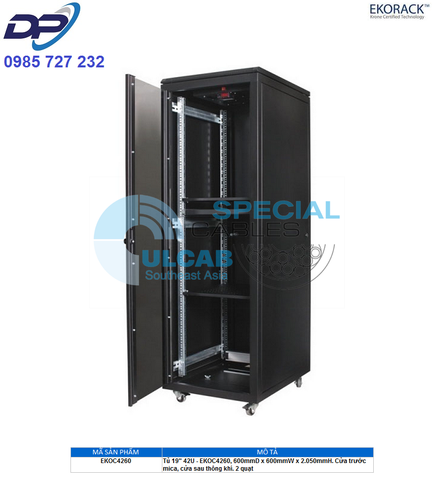 | EKOC4260 | Tủ 19″ 42U – EKOC4260, 600mmD x 600mmW x 2.050mmH. Cửa trước mica, cửa sau thông khí. 2 quạt |