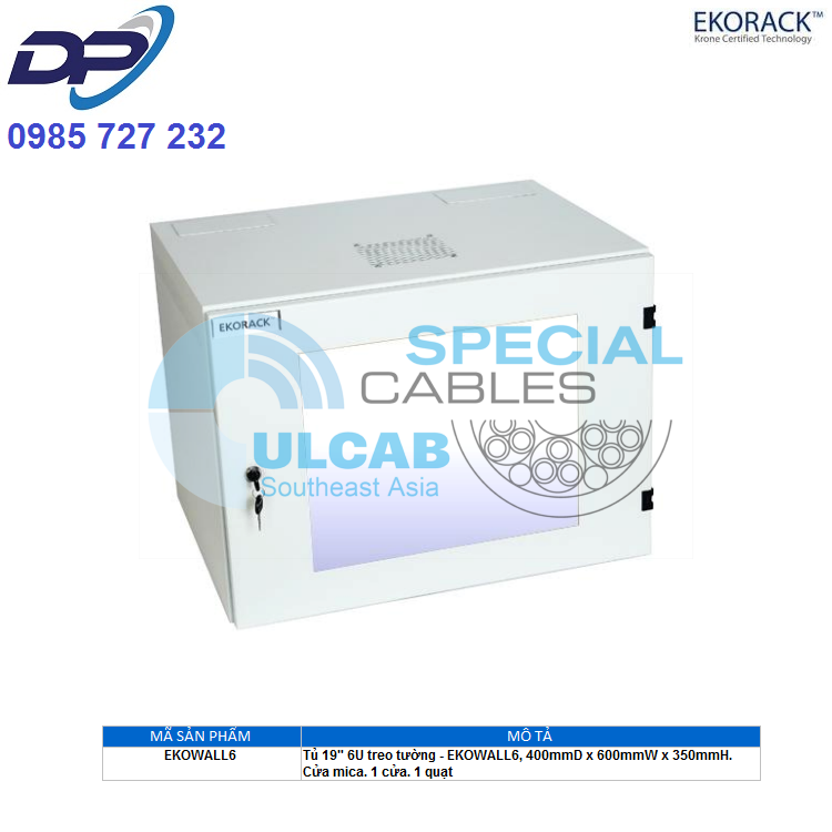 Cabinet EKORACK ( EKOWALL6 ) Tủ 19″ 6U treo tường – 400mmD x 600mmW x 350mmH. Cửa mica. 1 cửa. 1 quạt