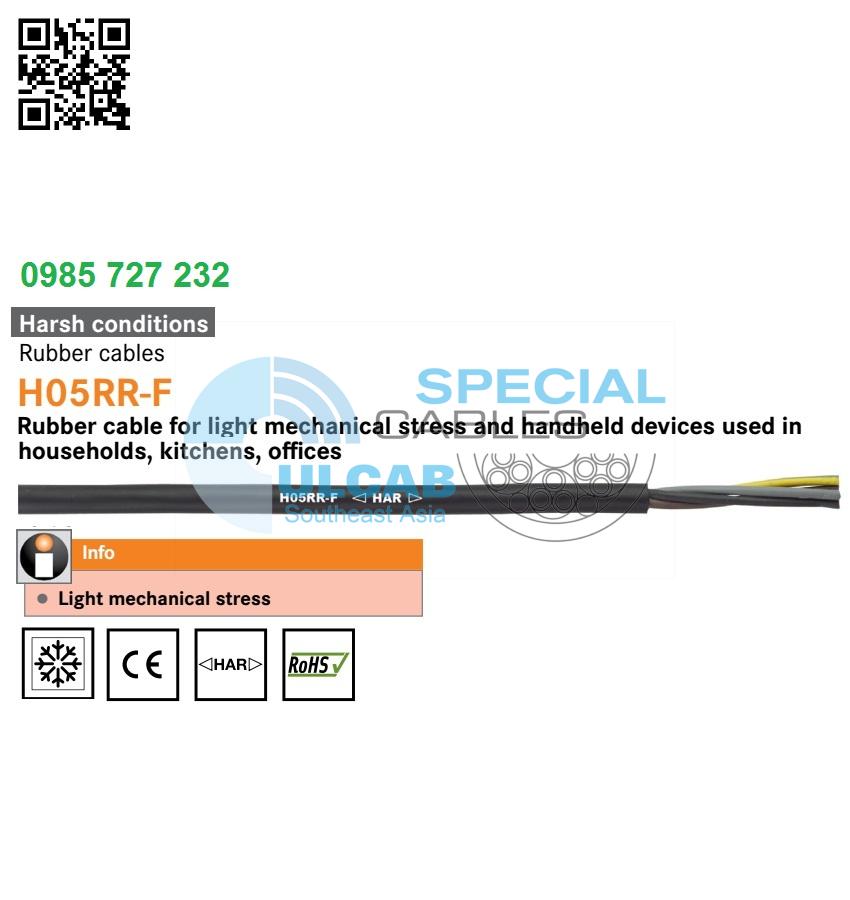 H05RR-F, HAR-certified, power and control cable for household and hand-held devices, rubber, braided conductor class 5/flexible, indoor use, flame-retardant