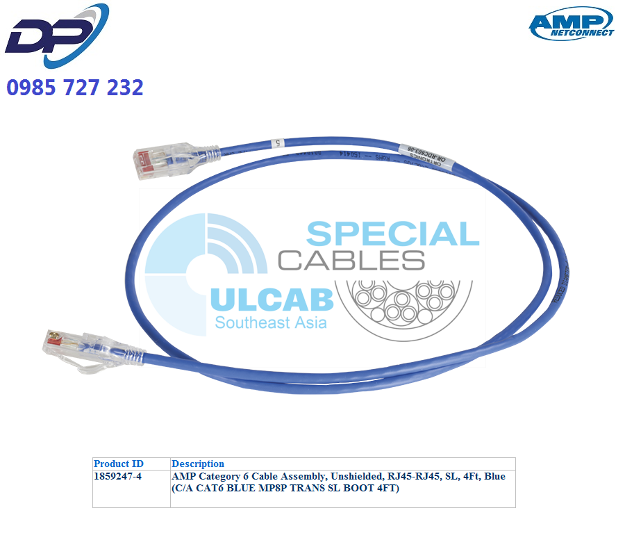 Dây Nhẩy AMP ( 1859247-4 ) Patch Cord CAT 6 Cable Assembly, Unshielded, RJ45-RJ45, SL, 4Ft, Blue | Chính Hãng – Giá Tốt Nhất
