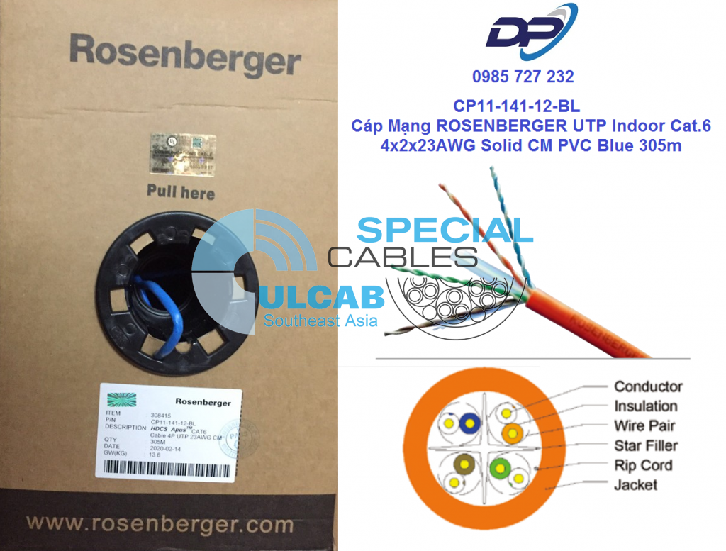 “CP11-141-12-BL” Cáp Mạng ROSENBERGER UTP Indoor Cat.6 4x2x23AWG Solid CM PVC Blue 305m | Chính Hãng – Giá Tốt Nhất