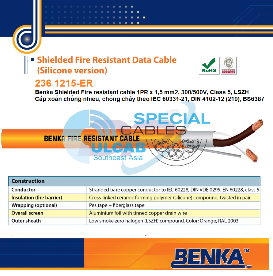 “236 1215-ER” Cáp Chống Cháy Benka 1PR x 1.5 mm2 Cu/Silicon/OSCR/LSZH, Orange, 500m | Cáp xoắn – chống nhiễu – chống cháy – Chính Hãng – Giá Tốt Nhất