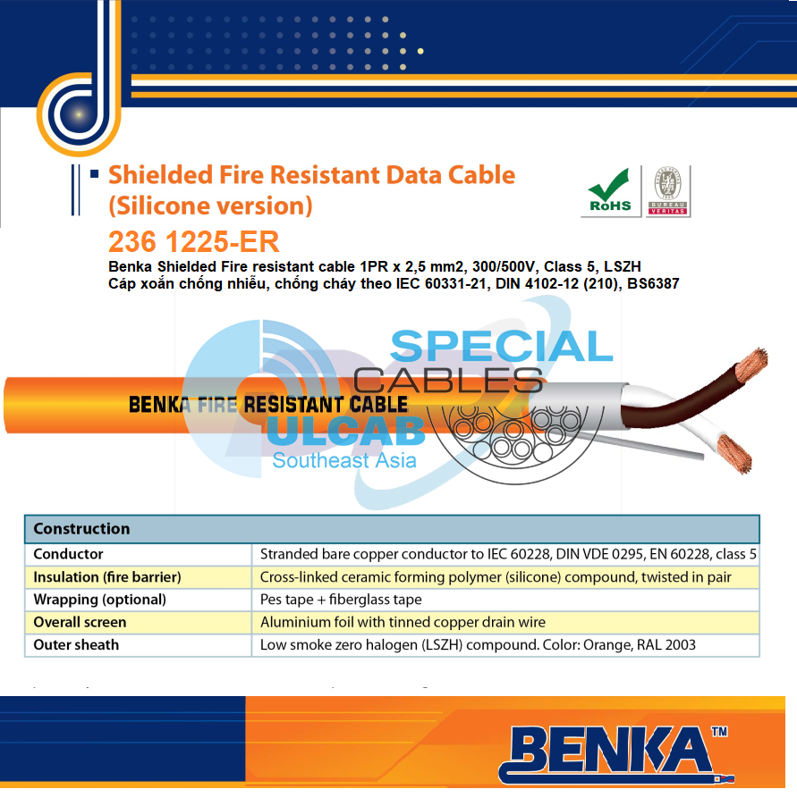 “236 1225-ER” Cáp Chống Cháy Benka 1PR x 2.5 mm2 Cu/Silicon/OSCR/LSZH, Orange, 500m | Cáp xoắn – chống nhiễu – chống cháy – Chính Hãng – Giá Tốt Nhất
