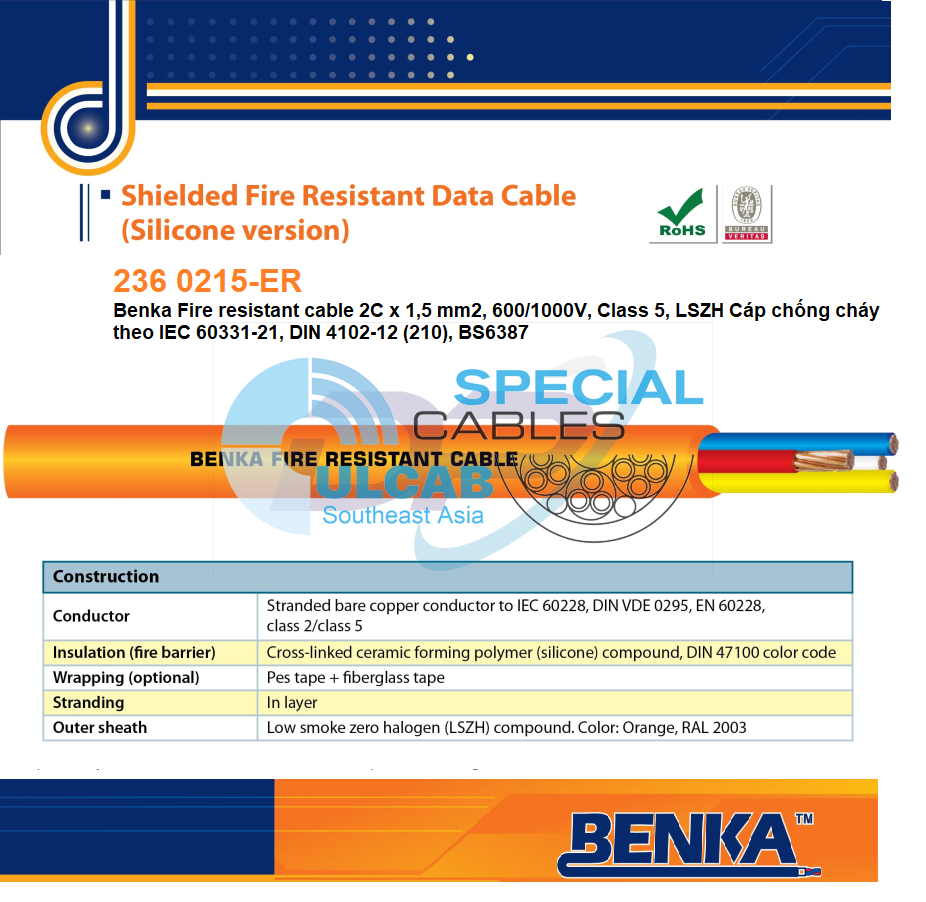 “236 0215-ER” Cáp Chống Cháy Benka 2C x 1.5 mm2 Cu/Silicon/LSZH, Orange, 500m | Chống Cháy – Chính Hãng – Giá Tốt Nhất