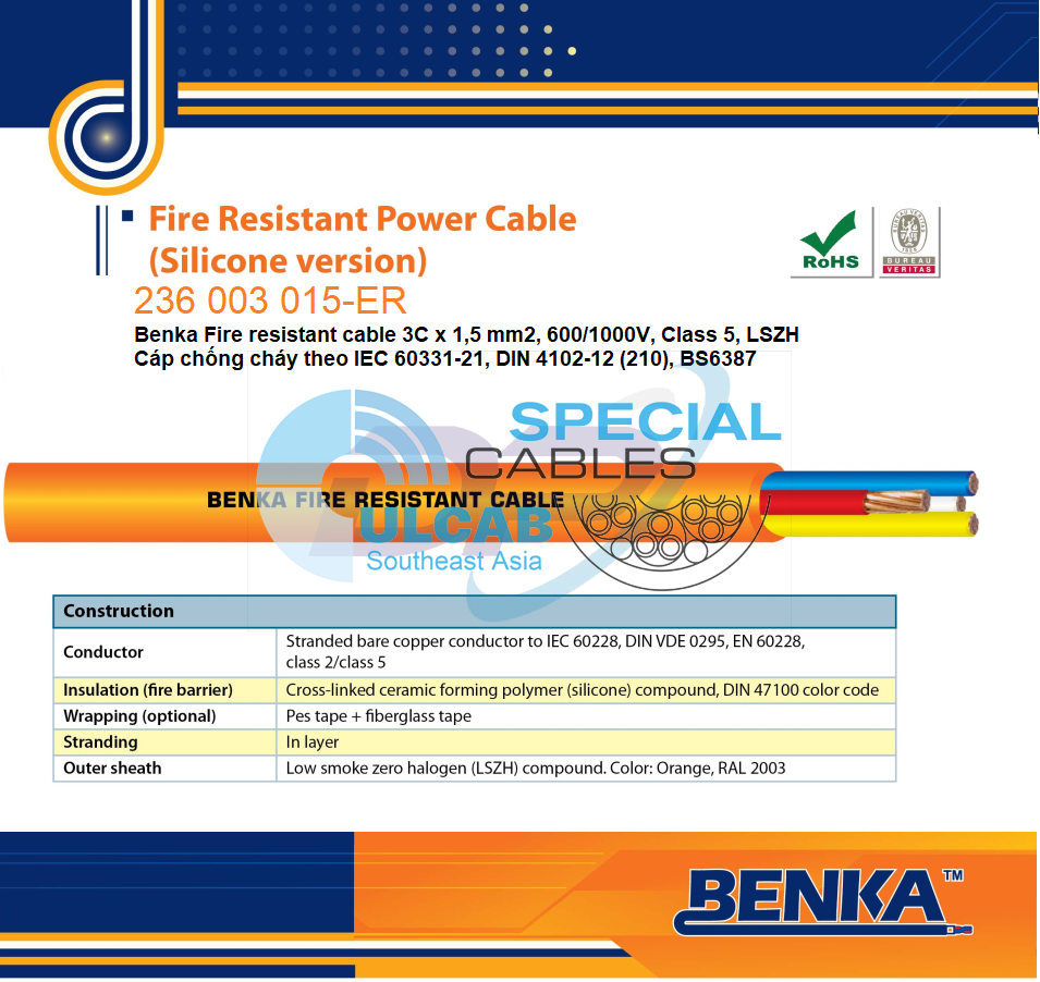 “236 003 015-ER” Cáp Chống Cháy Benka 3C x 1.5 mm2 Cu/Silicon/LSZH, Orange, 500m | Chống Cháy – Chính Hãng – Giá Tốt Nhất