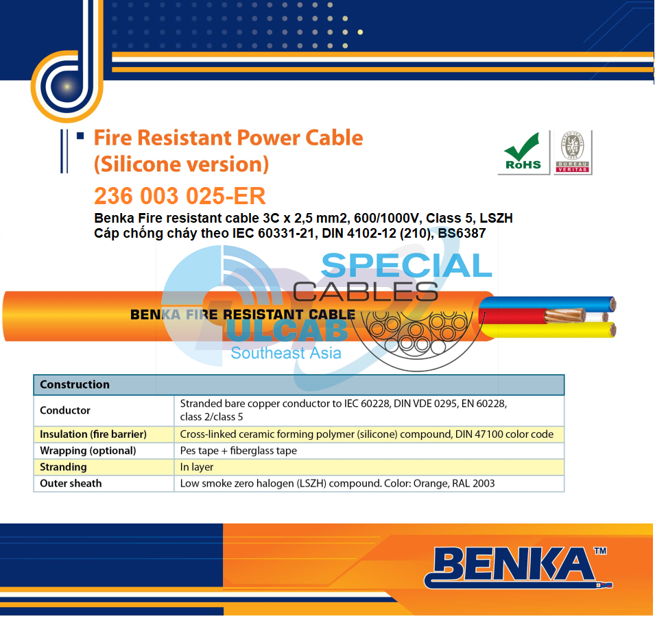 “236 003 025-ER” Cáp Chống Cháy Benka 3C x 2.5 mm2 Cu/Silicon/LSZH, Orange, 500m | Chống Cháy – Chính Hãng – Giá Tốt Nhất