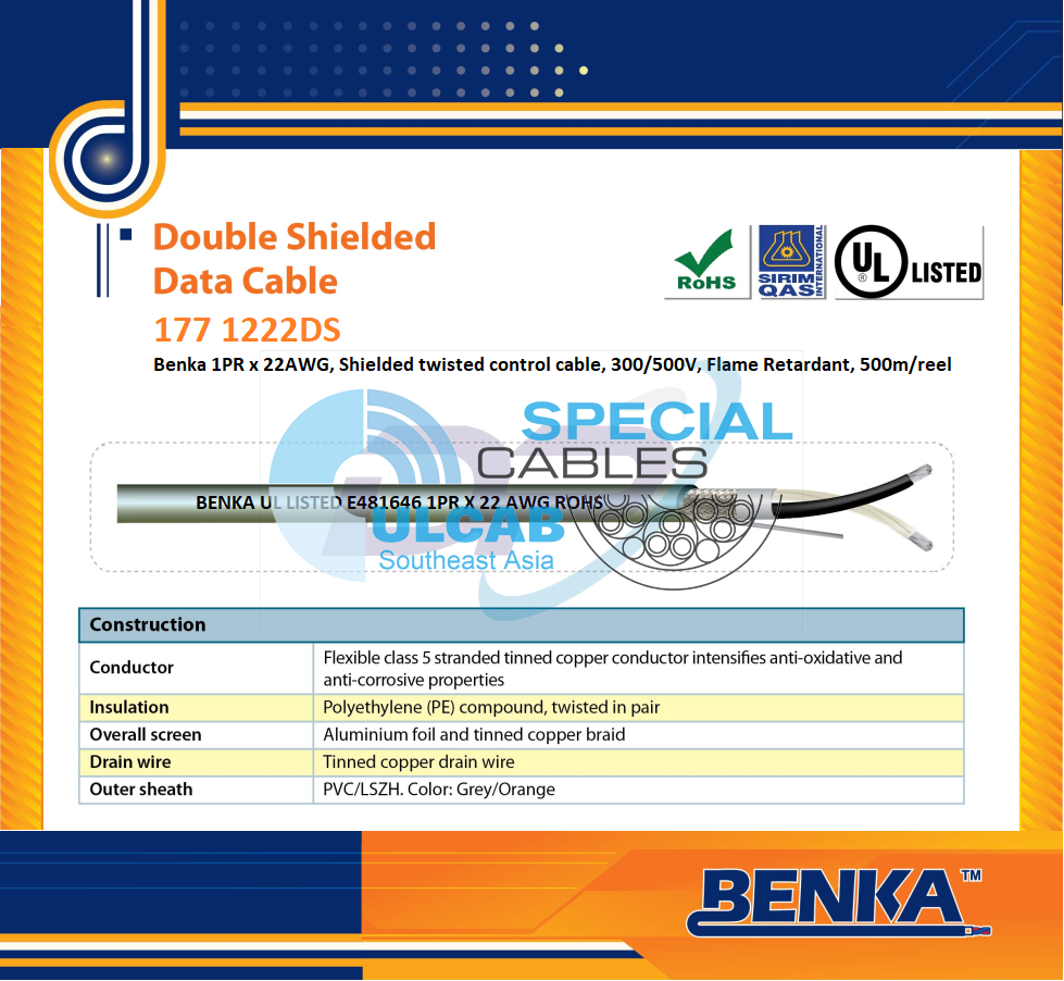 “177 1222DS” Cáp RS485 Benka 1Pair 22AWG TCU/PE/OSCR/PVC, Grey, 500m | Chính Hãng – Chống Nhiễu – Chống Bén Cháy